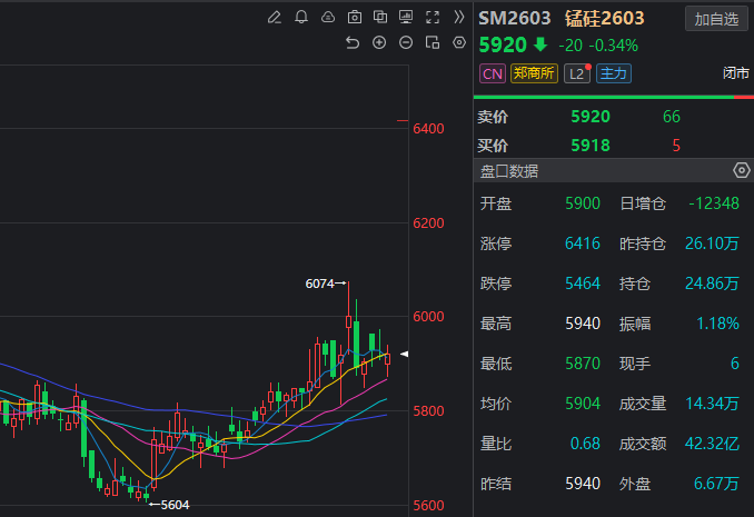 今日硅锰期货主力SM2603合约呈现典型的震荡整理走势。全日运行波澜不惊,价格在短期均线簇内窄幅波动,早盘开于5900点,短暂下探日内最低5870点后震荡回升,盘中最高5940点,尾盘最终收于5920点,较前一交易日收盘价格微涨4点。日线收出一根带较长影线的小阳k线。全天成交量环比微增224手至14.3万手,持仓量减仓1.2万手至24.9万手,仓单减少200张至30695张。MACD双线仍位于零轴上方,但二者差值极小,柱状线进一步缩短,显示中长期的多头趋势动能正在显著衰减,上涨力度疲软,市场处于“强趋势后的弱整理”状态,存在向零轴回归的技术性回调压力。KDJ指标三线均处于中位区域,未能形成有效的金叉或死叉发散,同样印证了市场缺乏明确的方向性动能,处于典型的震荡市特征之中。收盘价位于布林中轨与上轨之间,布林带口无明显扩张,预示波动率仍较低。综合来看,SM2603合约目前整体处于高位震荡整理格局。多空因素交织:一方面,长期均线系统仍提供支撑,表明市场大环境尚未转空;另一方面,MACD动能衰竭、持仓大幅缩减、价格受制于短期均线簇,都显示上攻乏力,市场急需新的催化剂。预计短期将继续在5850-6000点的核心区间内震荡。需要突破当前的窄幅震荡箱体,才能确立下一阶段的主趋势。(仅代表我方观点,不做投资建议,市场有风险,投资需谨慎)