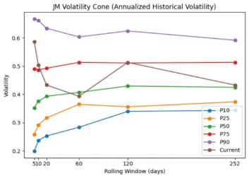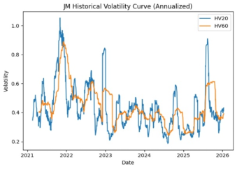 波动率是期权交易的灵魂,而当前焦煤的波动率结构正在发出诱人的信号。虽然20日历史波动率(HV20)处于63.6%的偏高分位,但更值得注意的是短端(5日/10日)波动率的飙升——这说明近期市场的剧烈波动更多是由短期情绪和事件驱动的,而非长期的基本面恶化。新合约上市首日,市场往往会因为对未知的恐惧而给予过高的隐含波动率定价。短端波动率的异常高企,意味着市场正在为“不确定性”支付高昂的保险费,这为卖方策略提供了赚取“情绪溢价”的丰厚理论空间。