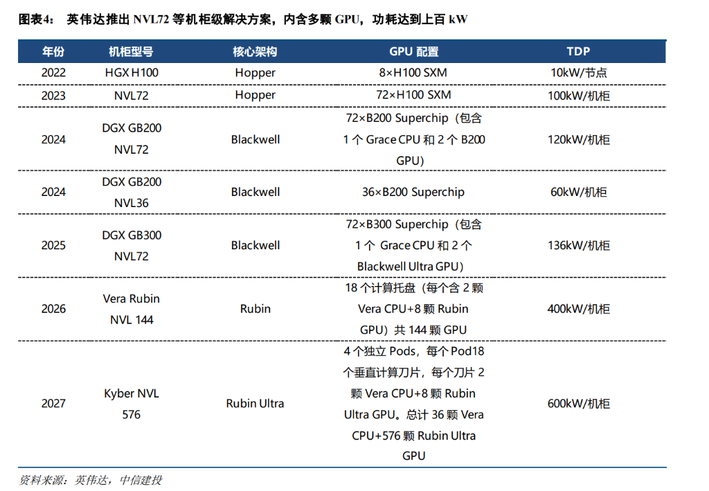 随着以英伟达 Blackwell B200 为代表的芯片单体功率突破 1000W,以及未来 Rubin 架构可能的进一步提升,单机柜功率正在向 MW(兆瓦)级迈进。报告分析认为,现有的 415V 交流供电体系在面对如此恐怖的功率密度时已显得力不从心。