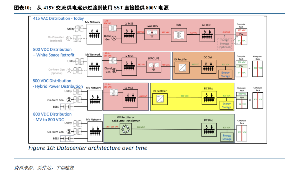 报告深入解读了英伟达发布的 800V 供电白皮书,认为这为行业确立了清晰的演进路径。英伟达规划的路线图显示,供电方案将经历从“交流”到“800V 直流(过渡)”,再到“800V 直流(Sidecar 方案)”,最终演进至“固态变压器(SST)”的终极形态。