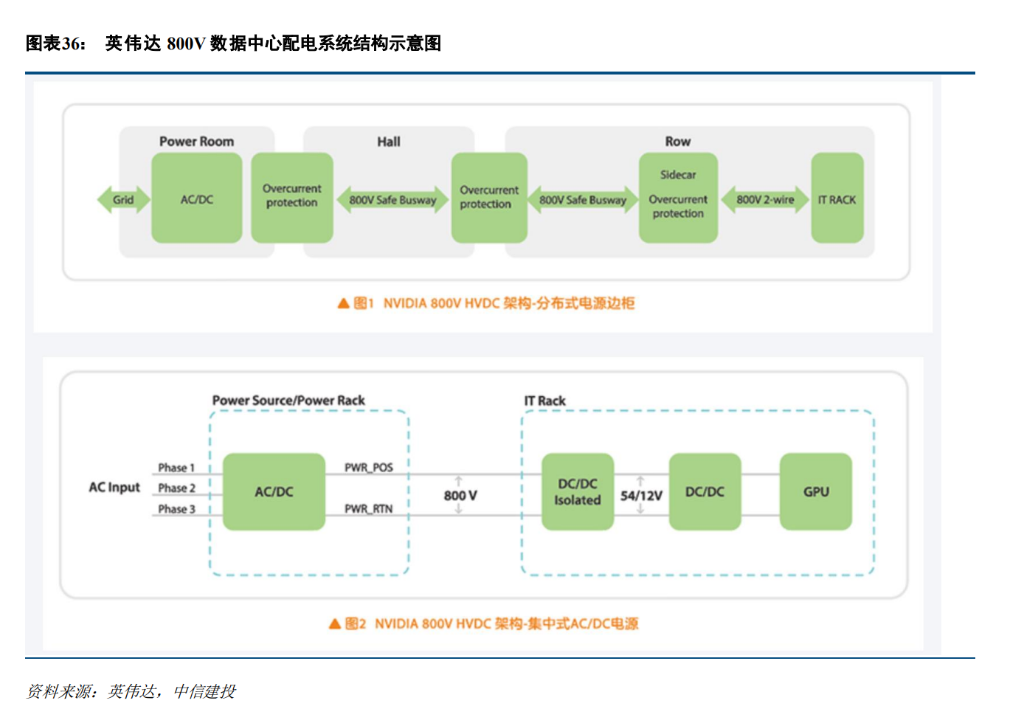 中信建投认为,随着单颗 AI 芯片功率突破1000W大关,传统的电力架构已逼近物理极限。为了支撑未来 GW 级别的算力需求,数据中心电源正处于从交流向 800V 高压直流(HVDC)彻底转型的临界点。这不仅仅是电压等级的提升,而是一场涉及架构重构的供应链革命。