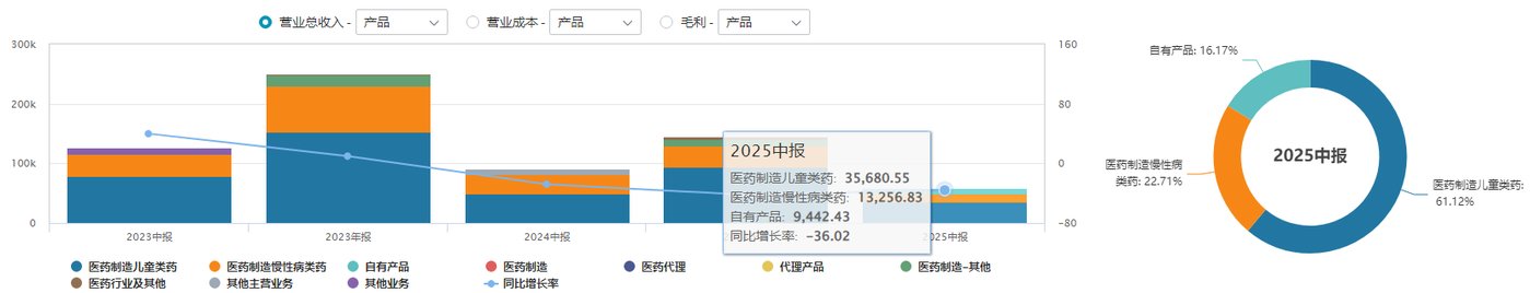 2025年中报数据进一步恶化,核心的儿童药营收3.57亿元,同比下滑28.93%,毛利率下降4.26个百分点至78.22%;慢病药营收更是腰斩至1.33亿元,毛利率暴跌48.73个百分点仅余18.5%。
