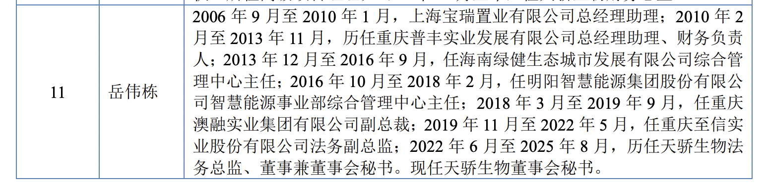 岳伟栋,1983年1月出生,本科学历。2006年9月至2010年1月,上海宝瑞置业有限公司总经理助理;2010年2月至2013年11月,历任重庆普丰实业发展有限公司总经理助理、财务负责人;2013年12月至2016年9月,任海南绿健生态城市发展有限公司综合管理中心主任;2016年10月至2018年2月,任明阳智慧能源集团股份有限公司智慧能源事业部综合管理中心主任;2018年3月至2019年9月,任重庆澳融实业集团有限公司副总裁;2019年11月至2022年5月,任重庆至信实业股份有限公司法务副总监;2022年6月至2025年8月,历任天骄生物法务总监、董事兼董事会秘书。现任天骄生物董事会秘书。