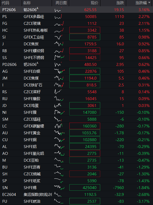 商品:国内期货主力合约涨跌不一,截至发稿,铂金涨3%,多晶硅、玻璃涨2%,热轧卷板涨1%,工业硅、焦炭、螺纹钢、不锈钢、钯金、沪银、焦煤、铁矿石、菜籽、橡胶、鸡蛋走高。沪镍、锰硅、碳酸锂、沪金、沪铜、沪铝、氧化铝、豆粕下跌,沥青、纸浆、沪锡跌超1%,集运指数跌2%,燃油跌超3%。