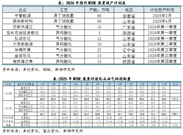 展望2026年,MTBE产能新增221万吨/年,异丁烷脱氢联产MTBE工艺贡献最大。因新能源的推广,国内汽柴消费预期下滑,虽然MTBE出口量增加,但难以缓解国内需求不足的现状,MTBE开工率在60%附近波动,说明产能过剩,因此对明年MTBE的投产持谨慎态度。