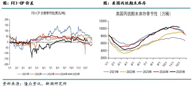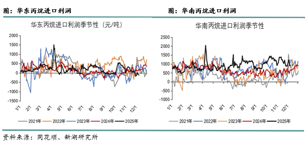 4月份因中国对美国加征对等关税,FEI价格大幅下跌,PG与FEI价差冲高。自9月份开始,PG与FEI的价差较往年偏强,一方面是中美开启新一轮关税谈判,10月30日达成展期一年的协议。另一方面也跟沙特CP下跌有关,FEI跟跌。2025年华南丙烷进口利润同比增加,尤其是下半年,沙特CP官价持续下跌,考虑贴水后,进口成本仍然低于去年,因此今年进口利润表现较好。