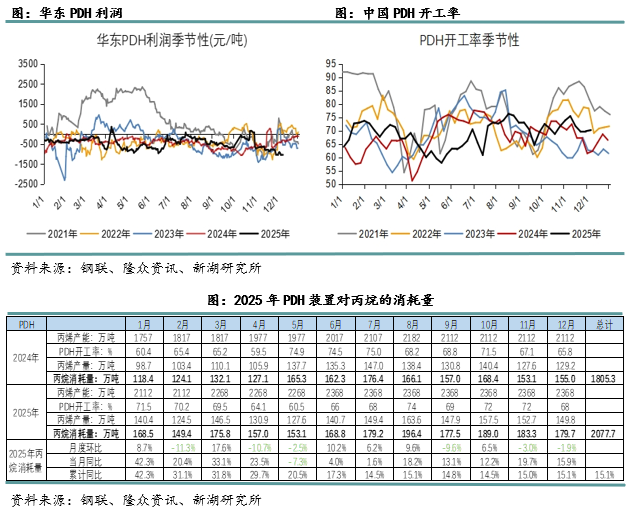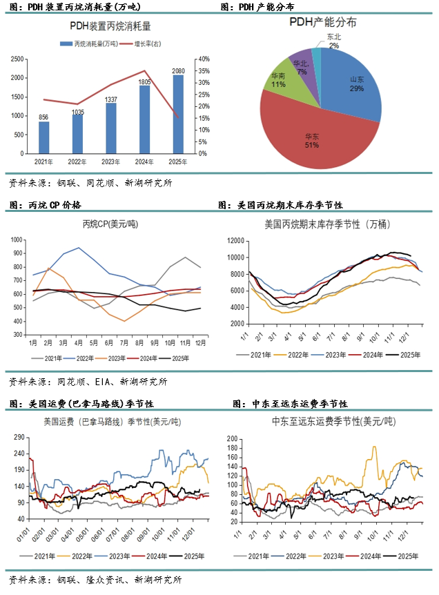 制丙烯工艺较多,相比2024年,2025年PDH工艺、石脑油裂解工艺和MTO工艺的产能占比均有提升。整体来看,2025年CTO工艺装置利润较好,其次是石脑油蒸汽裂解装置。目前PDH工艺占丙烯产能的30%,该工艺利润表现较差。今年丙烷进口成本较2024年下降6.9%,丙烯价格较2024年下降5.8%,因此亏损同比缩窄。受关税影响,2025年丙烷进口成本波动较大,10月沙特CP下跌,出乎市场意料,迎来丙烷成本最低点,后期随着中东装船延迟,进口成本持续上涨,导致装置利润达到年内低点。展望2026年,PDH新增产能约240万吨,虽然产能投放变缓,但因为产能基数大,年均开工率增加1%,将带来丙烷需求增量35万吨/年。