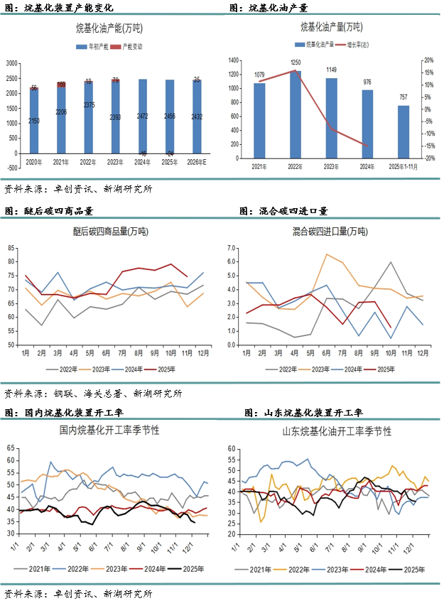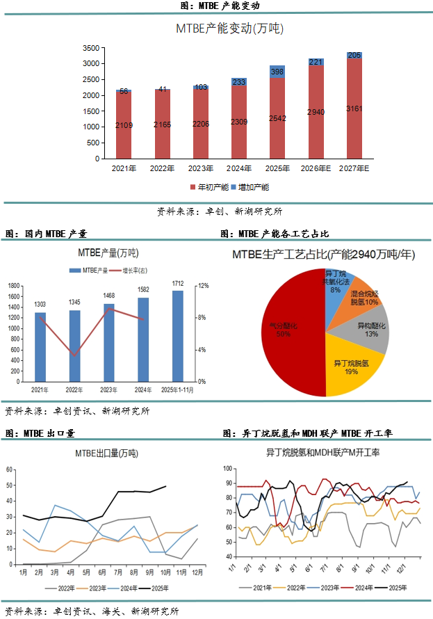下游需求——MTBE MTBE,是一种汽油添加剂,添加比例一般控制在13%以下。生产MTBE的工艺较多,既包括烷烃深加工,也包括烯烃深加工。截至2025年12月,国内MTBE产能达到2940万吨,其中异丁烷脱氢联产MTBE产能增长明显,占比提升至19%。2025年1-11月MTBE产量为1712万吨,同比增加18%。