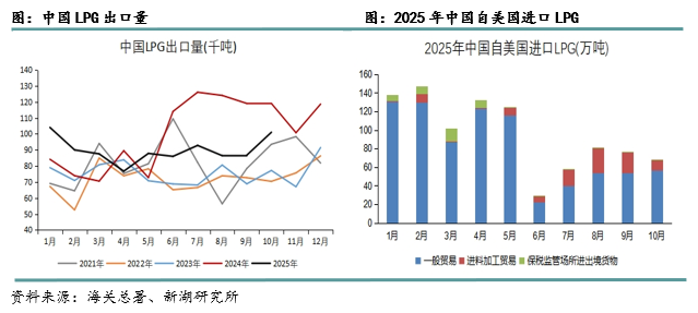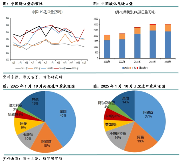 以海关总署数据为例,2025年1月至10月我国进口液化气3031万吨,同比增加0.5%,其中进口丙烷2391万吨,同比减少3.3%,美国虽然仍是第一货源国,但占比已经从2024年的66%下降到40%;进口丁烷613万吨,同比增加19%,丁烷来源国中,阿联酋、阿曼和沙特稳居前三,美国仍然排在第四,但份额下降明显。2025年4月份美国扩大了对伊朗的制裁范围,制裁内容不仅涉及原油,还包括LPG,这是伊朗收入的另一个主要来源。