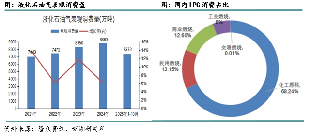 全球范围来看,LPG的最大下游是燃烧需求,占比高达45%,化工需求占比为26%。中国消费结构与之不同,化工消费占比68%,燃烧需求(民用、商用、工业和车用)占比32%。根据表观消费量=国产量(含自用量)+进口量-出口量,2025年1月至10月液化石油气表观消费量为7373万吨。化工需求下游繁多,从消费占比来看,PDH装置、烷基化装置、MTBE装置是较大的下游,其他工艺占比均在5%以下,因此本文主要分析PDH装置、液化石油气联产MTBE装置、烷基化装置以及顺酐这四大化工下游。