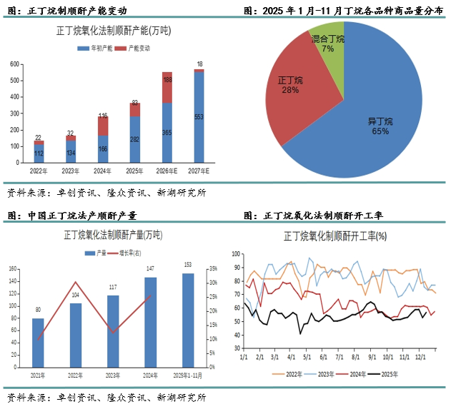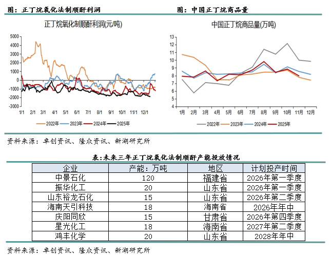 2024年至2026年是正丁烷制顺酐产能的集中投放期,2025年有6套正丁烷制顺酐装置投放,产能共计83万吨,2026年预计投放188万吨,其中中景石化产能为120万吨。新投产的正丁烷氧化法制顺酐装置,单套产能较大,原料以自主进口混合丁烷为主,或从自产的液化气中分离出正丁烷,提高装置经济性。