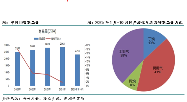 供应端,2025年LPG外放量(商品量)2765万吨,同比减少3.3%;进口量3625万吨,同比增加1.6%;出口量106万吨,同比减少12%。根据供应量=外放量+进口量-出口量,LPG 2025年总供应量6284万吨,同比减少0.4%。