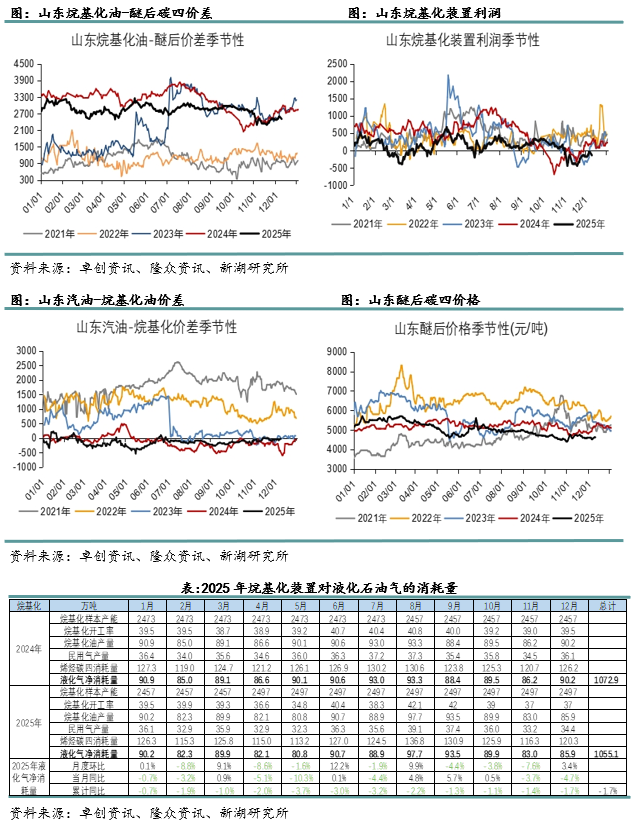 裕龙石化36万吨烷基化油装置于3月初投产,1000吨/天的醚后碳四转为自用,约占山东醚后市场总供应量的20%,这进一步增大了山东地区的醚后供应缺口。3月底裕龙石化一期二阶段1000万吨炼油产能预计投放,醚后碳四产量约为1000吨/天。2024年底镇海炼化二期1100万吨的炼油产能投产,2025年6月中旬开始外放烯烃气,目前主要销往安徽地区,部分流入山东。2025年烷基化装置开工率同比下降0.9%,装置利润大幅走弱,主要是烷基化油价格跌幅较大引起的。