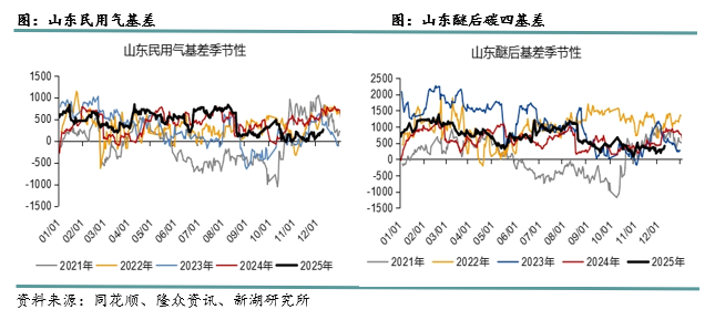 需求端,2025年化工需求量4106万吨,同比增加8.8%,主要是PDH和MTBE装置的需求增加:2025年PDH装置消耗丙烷约2080万吨,同比增加15%,MTBE装置消耗液化石油气约804万吨,同比增加9%。表观燃烧需求=进口量+外放量-出口量-化工需求-库存增加,2025年表观燃烧需求约2186万吨,同比减少12%。