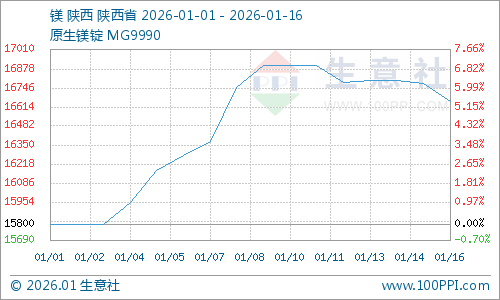据生意社商品行情分析系统监测:本月(1.1-1.16)陕西地区镁锭市场上涨,月初市场均价在15800元/吨,本周末市场均价在16650元/吨,涨幅5.38%。