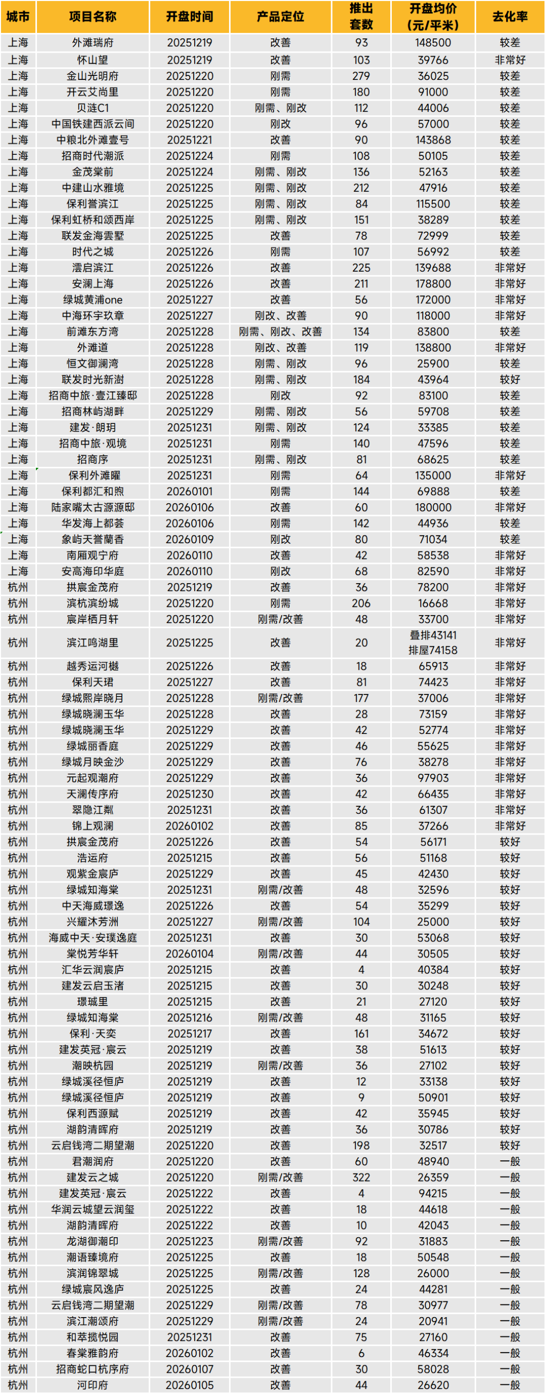 根据,12月15日-2026年1月11日,华东区重点城市上海、杭州累计开盘84次,共推出房源7017套,相比上月开盘量增加。其中上海4037套,杭州2980套。综合来看,华东地区本月开盘量增加,个盘去化良好。