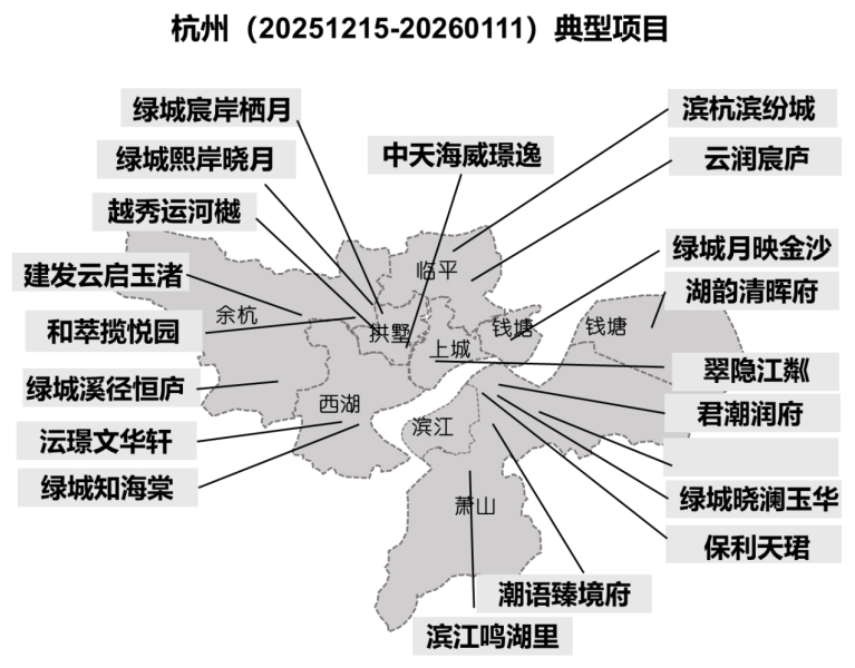 临近年末,杭州房企为冲刺年度业绩,推盘节奏保持高位。2025年12月15日至2026年1月11日,市区累计开盘50次,推出房源2980套,供应量小幅波动下滑。市场热度却进一步回落,本周期内仅8个项目触发摇号,较上期减少4个。
