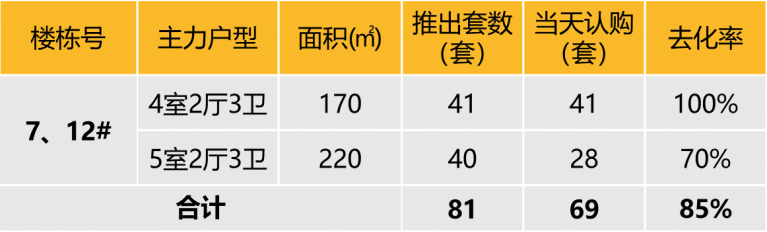 认购去化:项目本次开盘共计有205组家庭报名登记,中签率39.51%,开盘当日认筹69套房源,去化率85%。