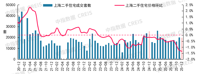 图:2020年12月至2025年12月上海二手住宅成交套数及二手住宅价格环比走势