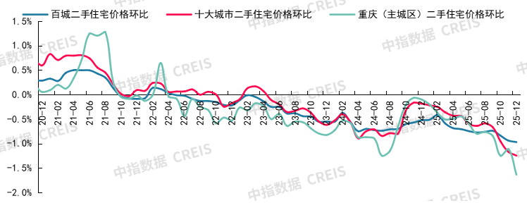 图:2020年12月至2025年12月重庆二手住宅价格环比走势
