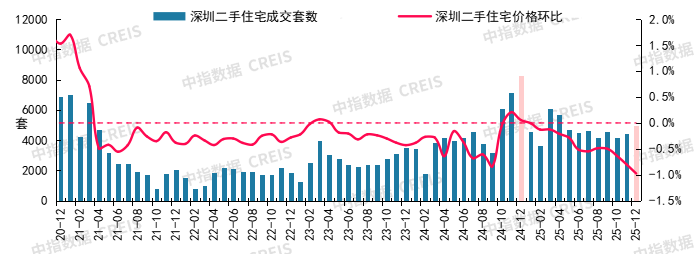 图:2020年12月至2025年12月深圳二手住宅成交套数及二手住宅价格环比走势