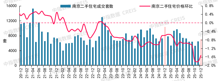 图:2020年12月至2025年12月南京二手住宅成交套数及二手住宅价格环比走势