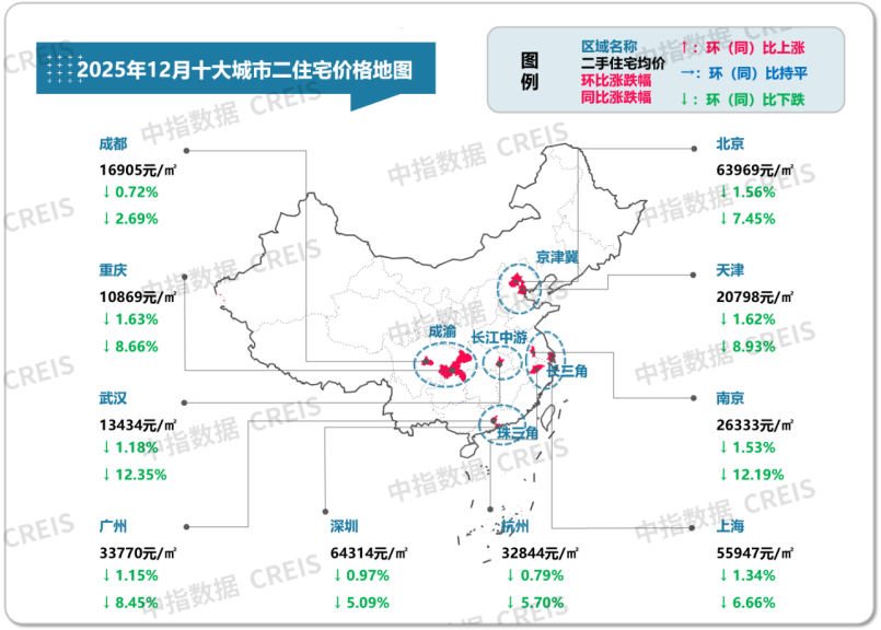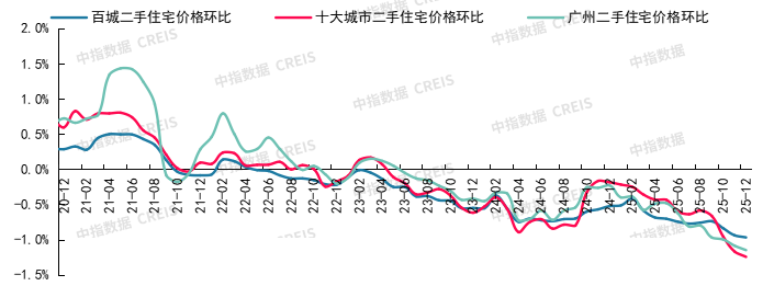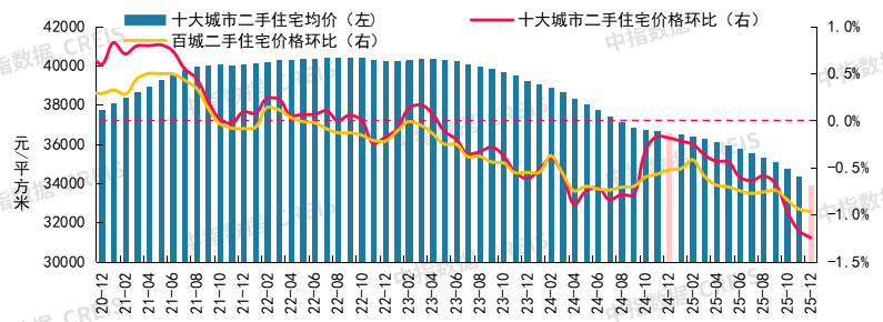 根据中国房地产指数系统百城价格指数,2025年12月,百城二手住宅均价环比下跌0.97%,同比下跌8.36%;十大城市二手住宅均价环比下跌1.25%,同比下跌7.32%。