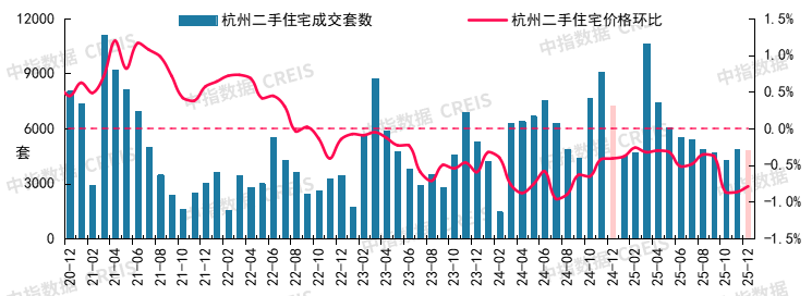 图:2020年12月至2025年12月杭州二手住宅成交套数及二手住宅价格环比走势