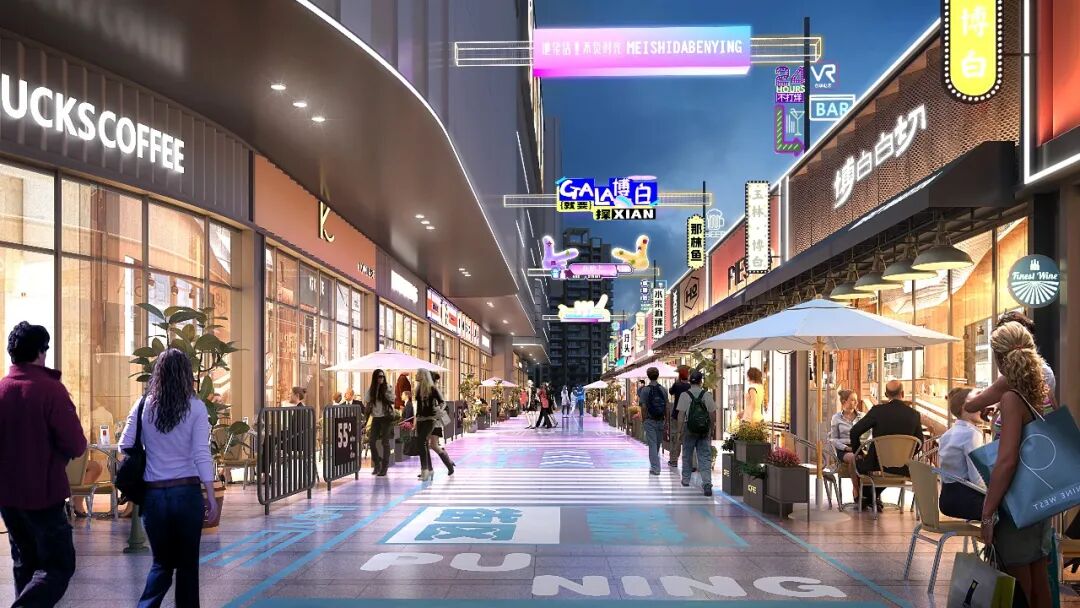 博汇广场前瞻性规划“栖西里”户外主题街区是项目践行“全时段”定位、激活博白夜间消费活力的战略支线。