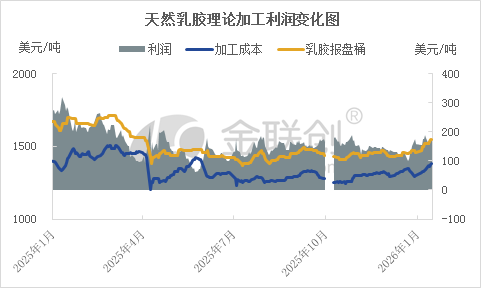 由图可见,天然乳胶近期加工利润盈利走扩。边境冲突与洪涝灾害造成泰国橡胶减产逾4.4万吨,叠加前期套利加仓,美金价格成交积极带动原料价格走势偏强,支撑成本。上游加工厂出货无压,期货市场震荡上涨,同时美元兑人民币汇率贬值,周期内跌破7元关口,多方利多带动下美金桶装船货价格上调。最终天然乳胶理论加工利润呈现继续走扩状态,截至1月15日,乳胶桶装美金价格收盘在1550美元/吨,理论利润在参考170美元/吨,环比上月上涨29.76%。