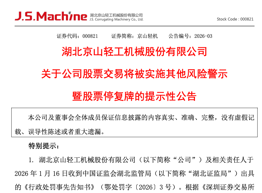 根据公告,公司股票自2026年1月19日(下周一)起停牌1天,1月20日复牌并被实施其他风险警示。届时,股票简称将由“京山轻机”变更为“ST京机”,日涨跌幅限制调整为5%。
