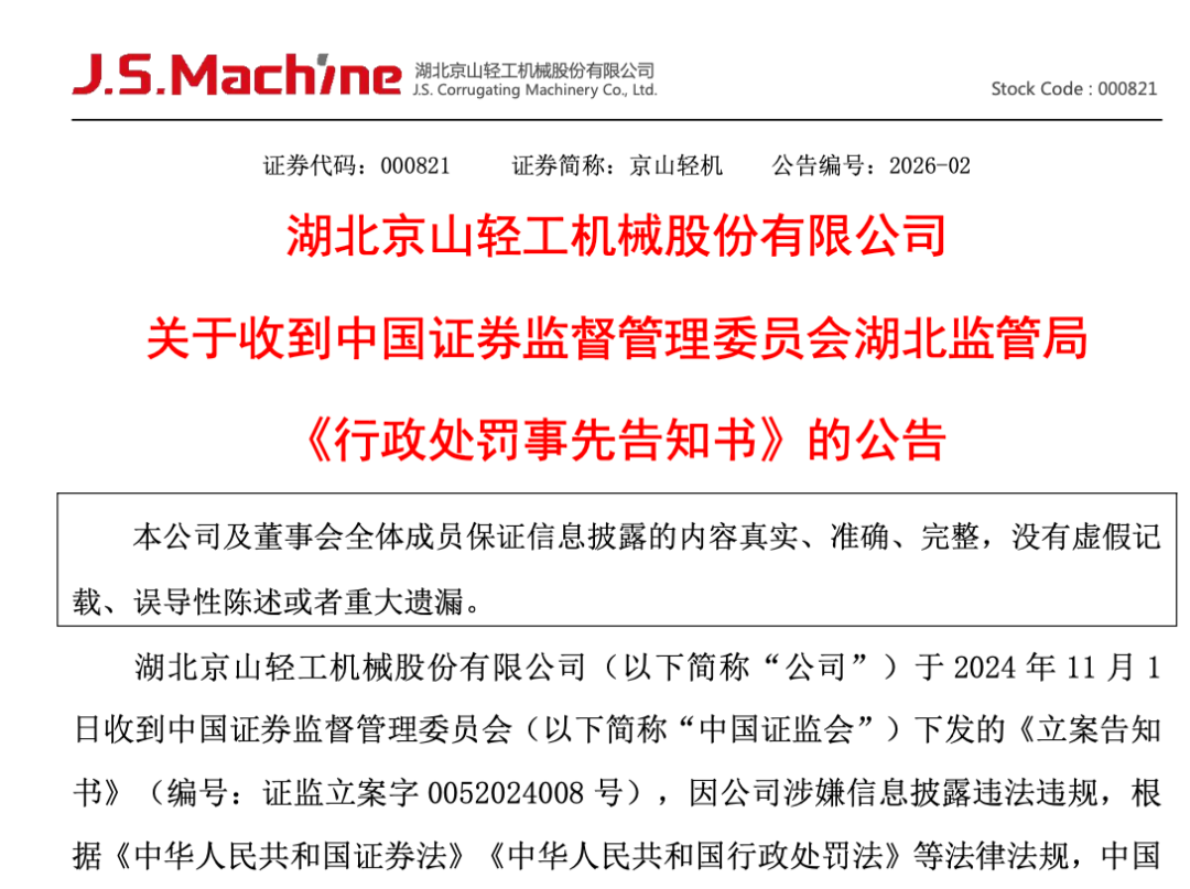 彼时,京山轻机在公告中称,立案调查不会对公司生产、经营和管理造成重大不利影响。