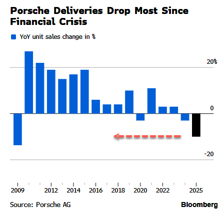 全球豪华跑车市场的领军者保时捷正面临自2009年金融危机以来最严峻的挑战,其“神话”般的高增长光环在2025年骤然黯淡。最新数据显示,这家德国制造商遭遇了16年来最大幅度的年度销量下滑,标志着其长期以来的市场韧性已被打破,公司正进入一个艰难的转型与重组期。