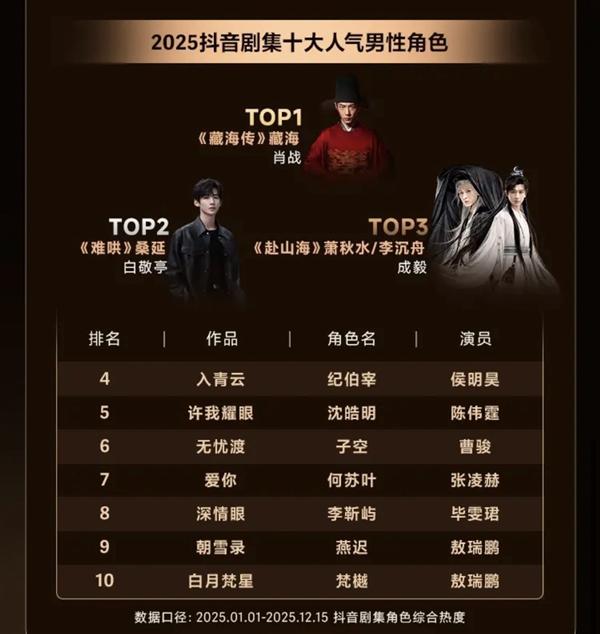 2025抖音剧集十大人气男/女角色出炉:肖战、赵露思夺冠