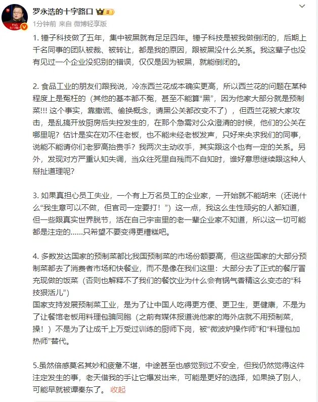 在回应前,请罗永浩先就四个月来在冷冻有机西蓝花事情上欺骗全国网友(你总不能说自己是刚知道的吧),给西贝,给无数宝妈,给全国餐饮业造成的危害,认真道歉,并赔偿相应损失。