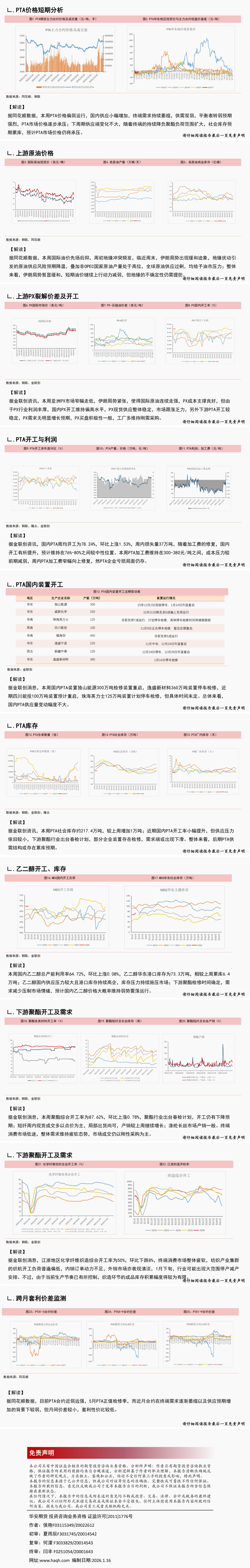 从供需格局来看,目前PTA开工负荷78.24%,短期国内PTA供应较前期有所增加,但今年国内无新增PTA装置,远期供应有缩紧预期。需求端,江浙地区化学纤维织造综合开工率为50%,环比下跌8%,终端消费市场整体疲软,纺织产业集群的织机开工负荷普遍偏低,内销订单动力不足,外销市场亦表现清淡,1月下旬,行业可能出现大范围停产减产安排。不过,由于当前生产节奏已有所控制,织造环节的成品库存积累幅度将较为有限。