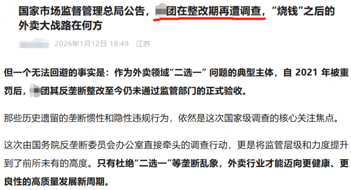 在此之前还有个小插曲,1月8日,据多家媒体报道,阿里巴巴集团在面向投资者的交流会上表示,淘宝闪购将在2026年坚定加大投入,目标直指市场份额的“绝对第一”(2025年12月的数据,美团与淘宝闪购的GTV占比为6:4)。这也直接撞上监管层调查的节点。