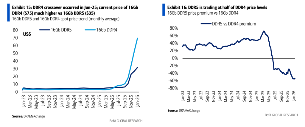 值得关注的是,DDR4现货价格出现结构性“倒挂”:自2025年6月起,16Gb DDR4价格(75美元)已显著高于同规格DDR5(35美元),形成罕见的价格倒挂现象。这主要源于三大存储芯片制造商持续将传统DDR4产能转向更先进制程,导致DDR4供给端持续紧缩。