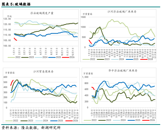 近日现货报价稳中偏强,近期部分厂家提涨,但成交情况较弱。产线上,周内暂无冷修/复产计划,周产整体小幅下滑,当前浮法玻璃日熔小幅提升至15.07万吨。需求来看,上周末主产区产销相对火爆,周中整体市场拿货情绪有所放缓,尤其后半周多地产销明显走弱,中游投机拿货情绪降温。整体来看,本周厂库库存环比去化250.50万重量箱,区域上以沙河及湖北地区去库更明显,主销区华南、华东小幅去库;厂库去化更多为到中游库存的转移。深加工订单方面,1月中旬订单天数9.3天,环比增加7.9%,同比+86.4%,好于预期。