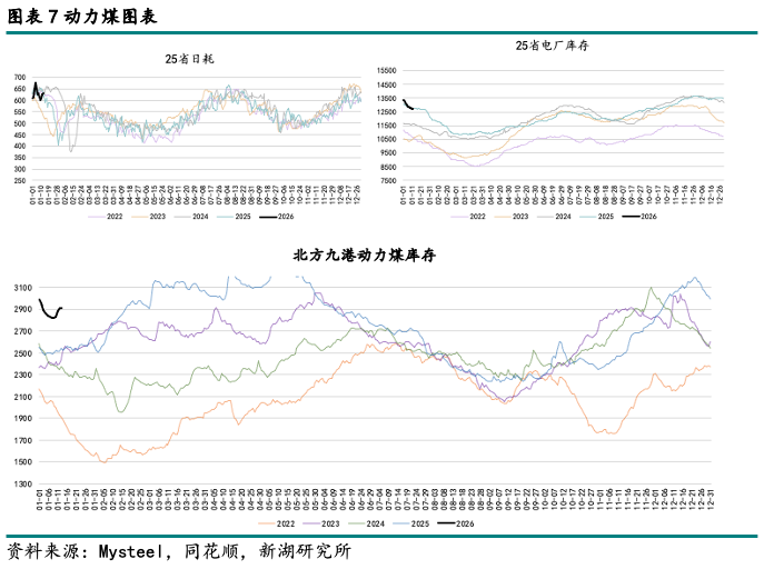 因中旬回暖影响,本周日耗整体有所回落。三九期间,因冷空气偏弱,且位置偏北,中东部迎来一波大幅升温。本周末起,冷空气影响将有所恢复,全国大部将迎来降温,气温在下旬前逐步转为较同期水平偏低状态。非电需求暂稳,煤制尿素开工小幅上升,煤制甲醇开工相对平稳,建材端开工环比保持下降。