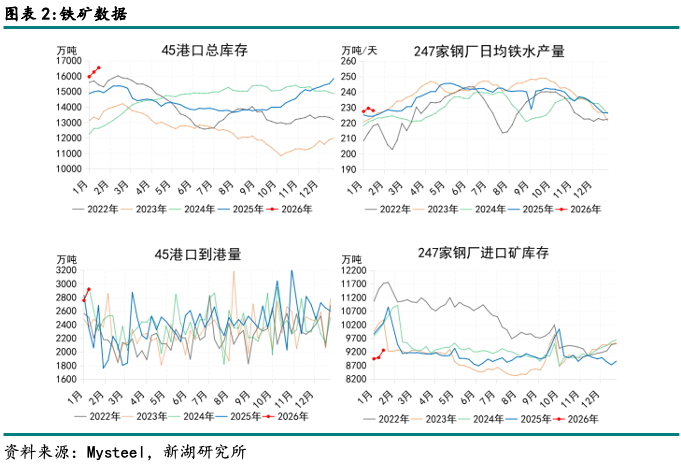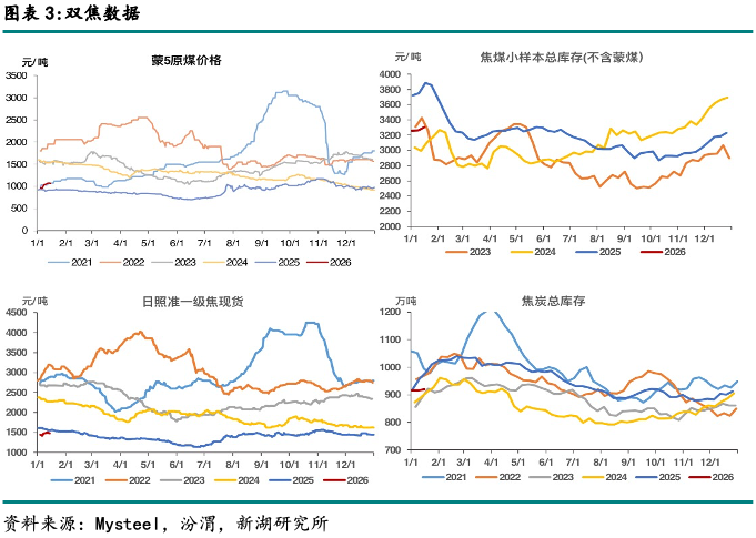 焦煤方面,供给端国内煤矿元旦后继续复产,开工率回升至88%偏高水平,蒙煤通关量高位运行,市场有蒙古口岸将再度测试2000车通关的传闻,内陆供应增加,海漂煤方面利润持续倒挂,到港量到春节前预计难有大幅增量,焦煤供应总量充足。需求端下游第一阶段冬储已经进入尾声,煤矿订单饱满,期现正套锁住现货流动性,预计要补到1月底,现货短期难跌。库存呈现上游矿山去库、洗煤厂及蒙煤口岸累库、港口与下游去库的格局,国内总库存继续累库,但库存流转上已经由从上游向下游转移。