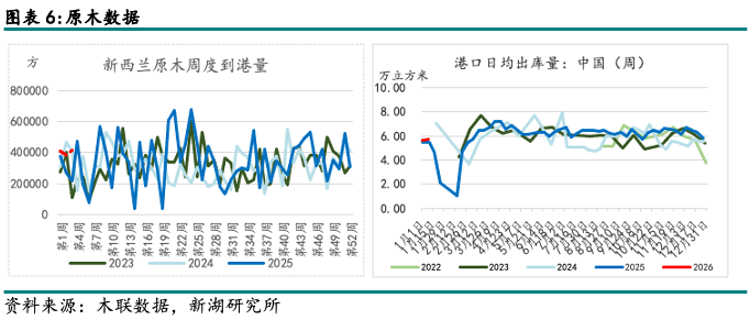 现货价格来看,山东维持相对稳定,江苏部分规格有一定缺货情况,价格重心上移。1月9日当周:到港量有所回落,新西兰原木到港量48万方,环比减少5.25万方;本周预计到港量将有一定增加。需求上,整体出货情况相对维持、略有好转,区域间分化:呈现南强北弱态势。库存方面,针叶原木累库趋势延续,环比增加2万方;分材种看:北美材累库最多,辐射松次之,云杉有所去库;分港口看:江苏去库延续,山东港口压力仍有所增加。