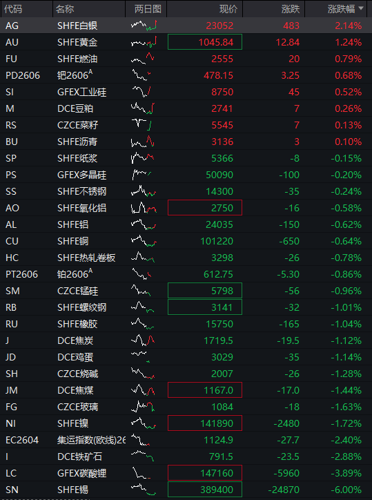 商品:国内商品期货多数走低,截至发稿,沪银涨2%,沪金涨1%,燃油、钯金、工业硅、豆粕、菜籽、沥青上涨,纸浆、多晶硅、不锈钢、氧化铝、沪铝、沪铜、热轧卷板、铂金、锰硅下跌,螺纹钢、橡胶、焦炭、鸡蛋、烧碱、玻璃、沪镍跌超1%,集运指数、铁矿石跌超2%,碳酸锂跌近4%,沪镍跌6%。