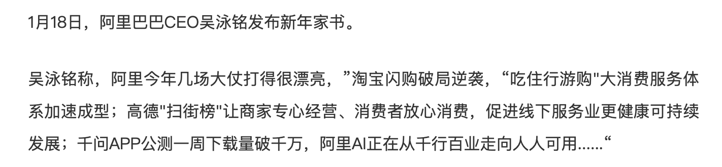 瑞财经 吴文婷 1月18日,据媒体报道,阿里巴巴CEO吴泳铭发布新年家书。