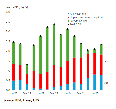 据追风交易台,瑞银在最新的研报中指出,在表面依然稳健的增长数据之下,美国经济的扩张基础正在迅速变窄:投资、消费与就业的边际改善,几乎全部系于人工智能这一单一主题。 一旦AI投资放缓或资产价格回调,当前扩张将失去核心支点。