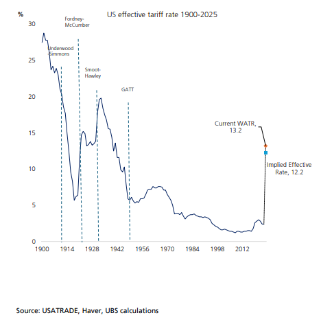 同时,关税冲击正在以“慢变量”的形式重塑通胀结构。美国有效关税税率已从年初的2.5%跃升至13%以上,规模相当于一次占GDP约1.1%的隐性增税。瑞银认为,这并非一次性冲击,而是将在未来数年持续推高核心通胀,使其长期高于美联储2%的目标。