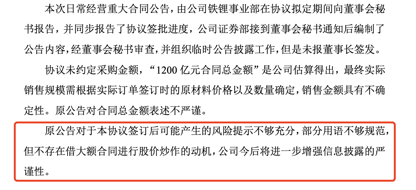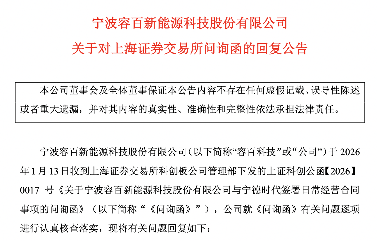 同一日,容百科技披露关于对上海证券交易所问询函的回复公告,称协议未约定采购金额,“1200亿元合同总金额”是公司估算得出,最终实际销售规模需根据实际订单签订时的原材料价格以及数量确定,销售金额具有不确定性。