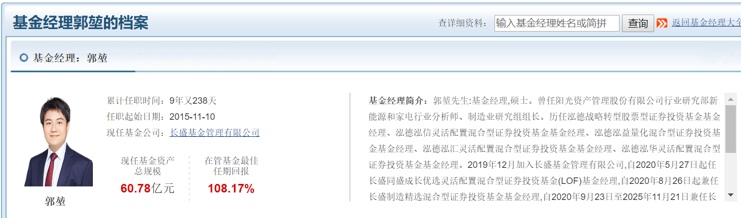 其中,郭堃自2020年5月起管理的长盛同盛成长优选(LOF),任职回报达108.98%,为其在管累计收益率最高的产品。