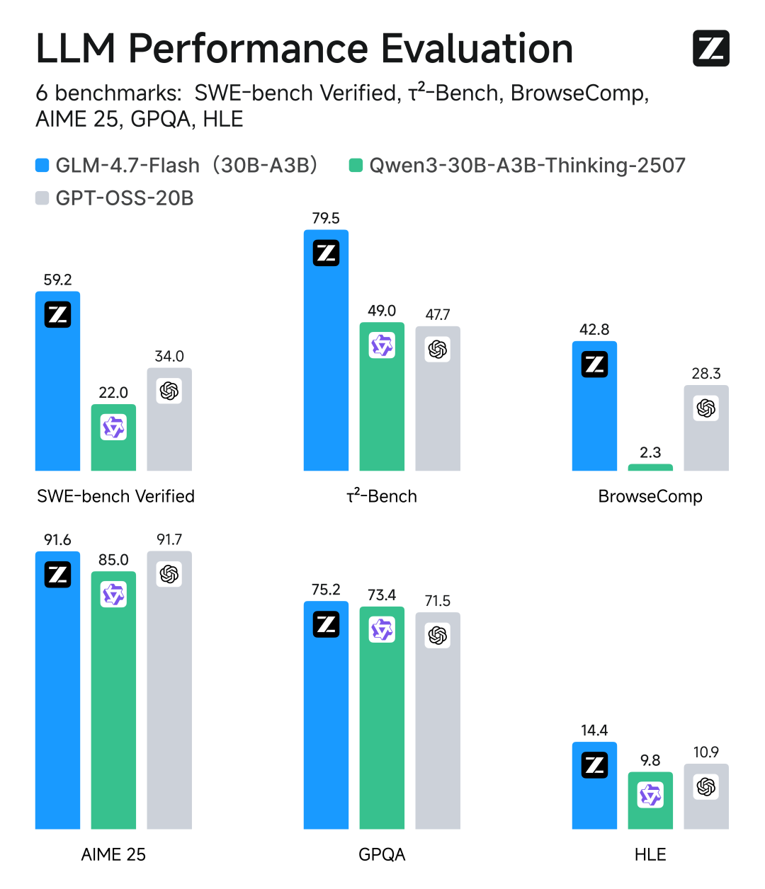 GLM-4.7-Flash是一个混合思考模型,总参数量为30B,激活参数量为3B,作为同级别SOTA模型,为轻量化部署提供了一个兼顾性能与效率的新选择。