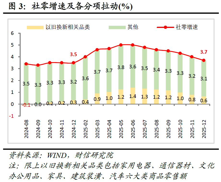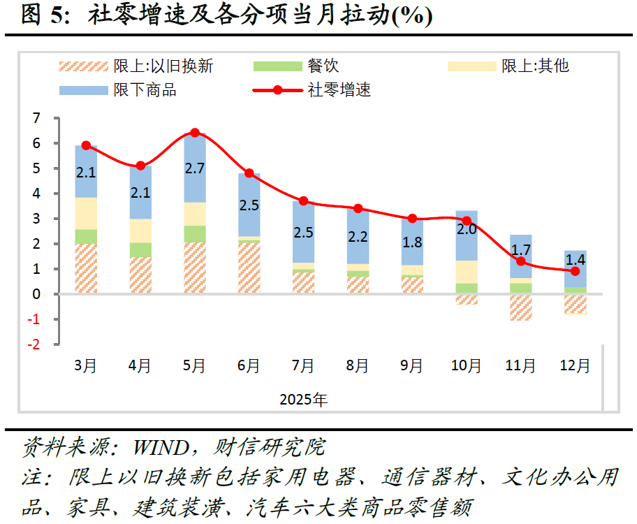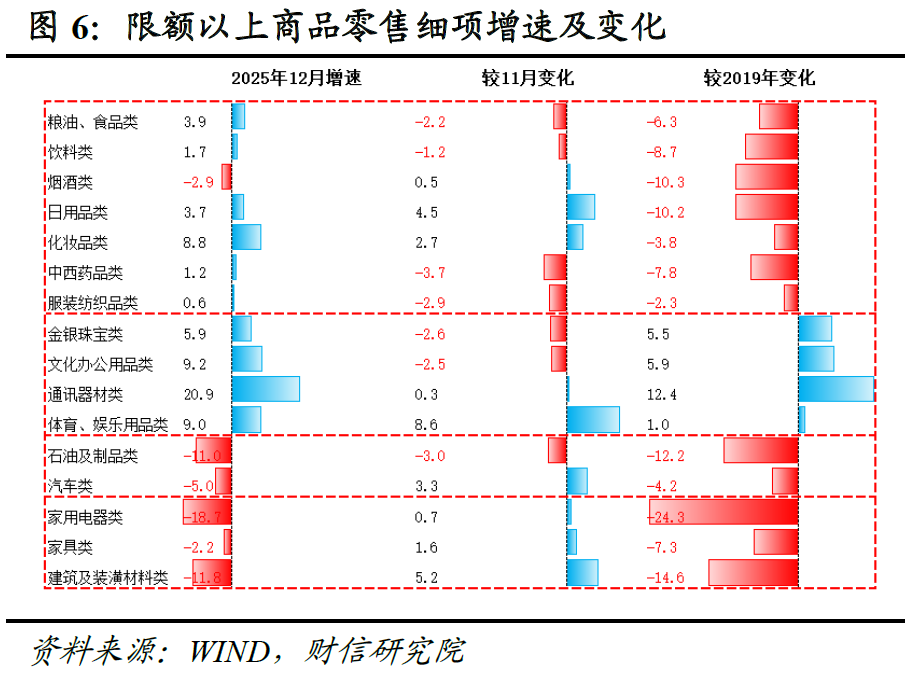 12月份消费放缓压力依旧突出。当月社零同比增长0.9%,较上月回落0.4个百分点,环比增长-0.12%,连续两个月为负。分结构看,主要拖累因素有三:一是餐饮收入增速放缓较多,其在去年低基数的基础上仍较上月回落1.0个百分点,拖累显著。二是中低收入群体消费有所走弱,受四季度居民收入、外出务工劳动力人数增速双双放缓影响,代表中低收入群体消费的限额以下商品零售增速回落较多,对社零的拉动较上月降低0.3个百分点(见图5)。三是除以旧换新相关品类以外的限额以上商品回落较多,受上年同期高基数的影响,该项消费对社零的拉动较上月或降低0.3个百分点左右(见图5)。相比之下,以旧换新相关品类的消费增速虽多数仍为负增长,但其降幅较上月有所收窄(见图6),其对社零的拉动反而较上月有所提高;同时,服务零售累计增速较上月提高0.1个百分点至5.5%,已连续四个月改善。